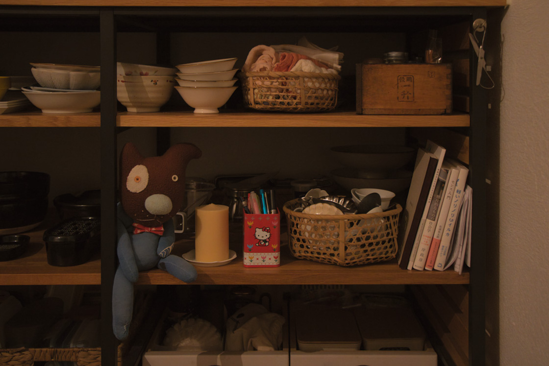 棚には、日常使いの器の横にペン立てがありノートが積まれ、その隣には読みかけの本。さらに、お気に入りのぬいぐるみが、器と器のあいだにちょこんと座っています。