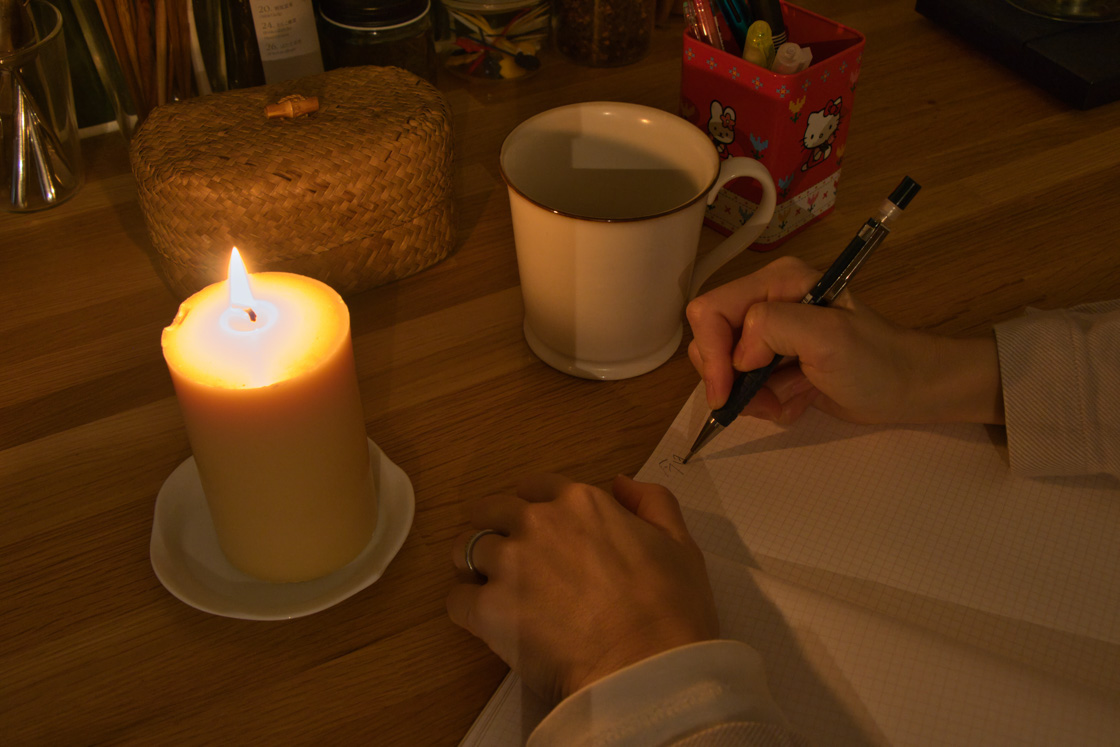 夜のキッチンで、蝋燭の灯りに照らされながらペンを走らせるこの時間が