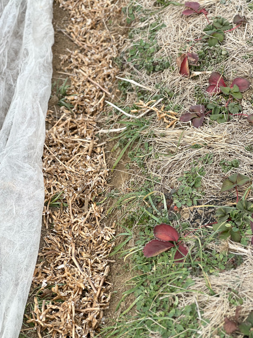 年が明けて、大豆の刈り取った後の様子。突き出ていた茎はもう根が朽ちてしまっていて、倒すとホロリと取れてしまいます。不耕起栽培は基本的には作物を根っこごと引き抜くことはしません(もちろん人参や芋類以外)。