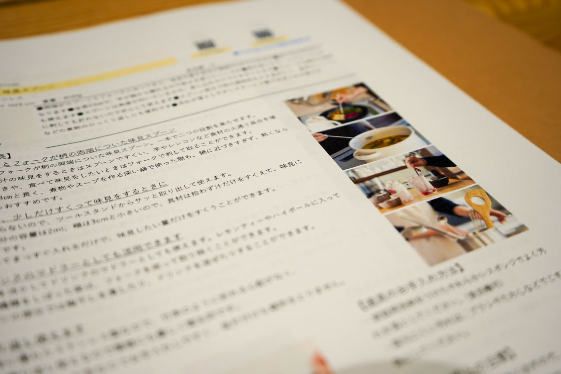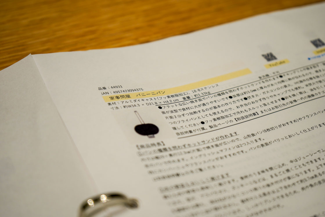 久保寺:家事問屋の製品は、ありきたりな形で特徴やこだわりが分かりづらいんです。展示会でのスタッフの対応はもちろん、販売店さんや使い手にもそれが伝わるようにひとつひとつの製品の特徴マニュアルもつくりました。店頭用のポップも用意しています。